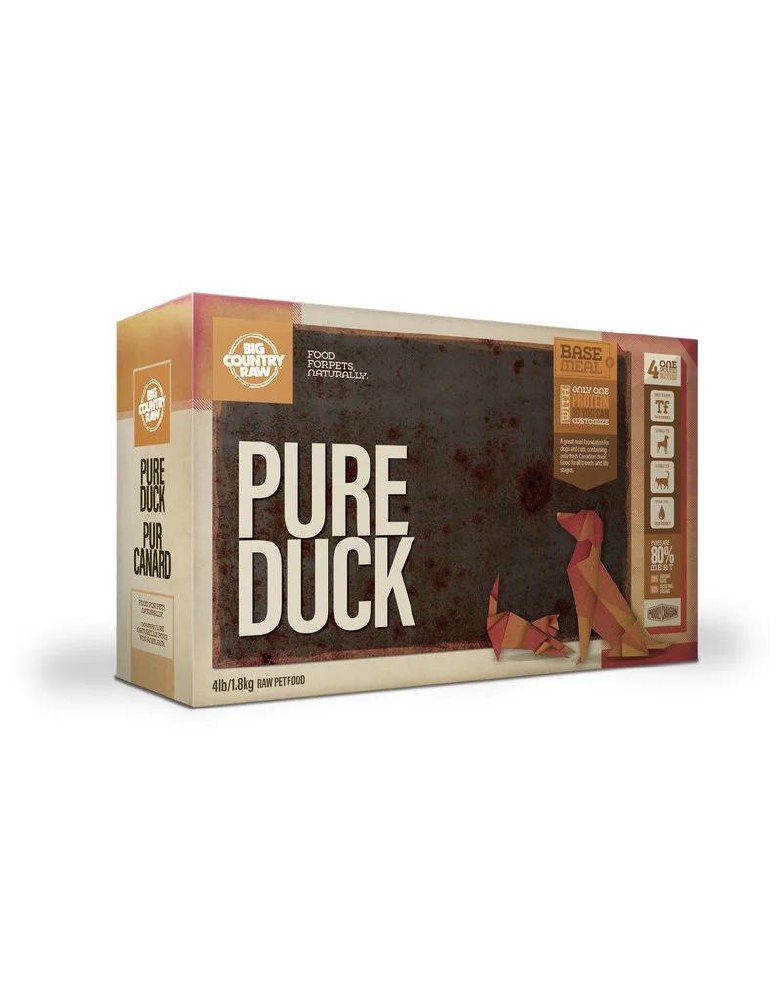 Duck contains all 10 essential amino acids required by dogs and is also a rich source of iron, zinc, copper and selenium. An excellent protein with a slightly wilder taste than chicken or turkey, dogs and cats love the taste of fresh Canadian Duck.