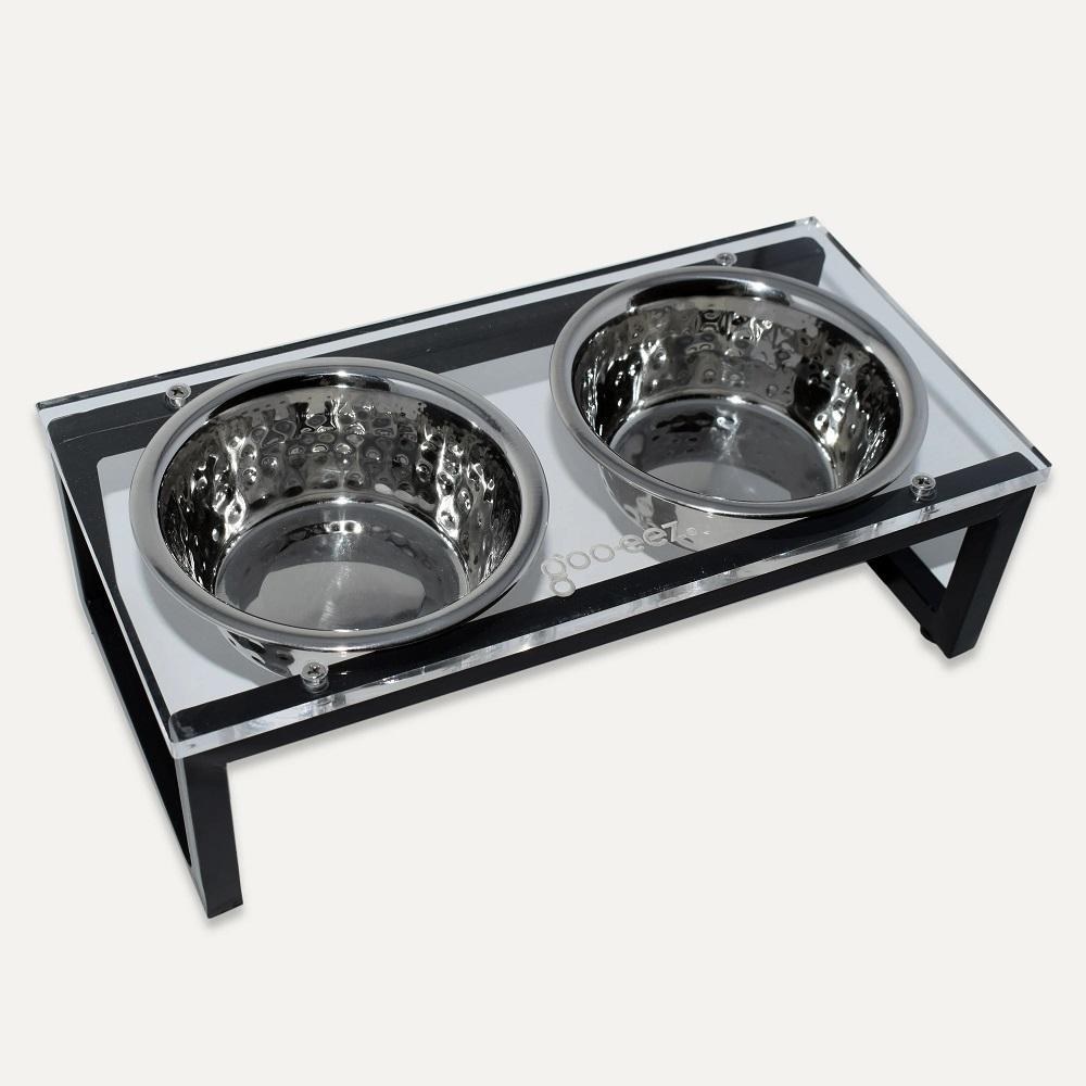 Acrylic and iron double feeder with removal hammered stainless steel bowls. Elevated, water resistant and dishwasher safe bowls for easy cleaning!