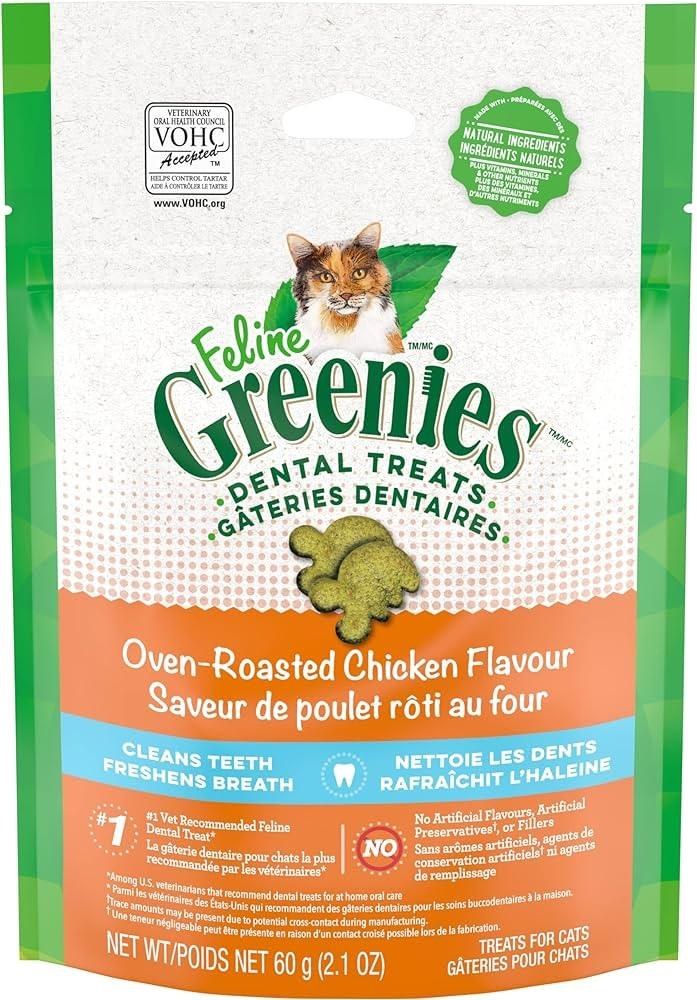 FELINE GREENIES Oven Roasted Chicken Flavor Dental Cat Treats were designed to help keep your cat’s teeth clean and healthy. The crunchy texture of these irresistible cat snacks helps clean teeth, reduce tartar buildup, and freshen cat breath, letting you enjoy cuddle time even more. Made with natural ingredients plus vitamins, minerals, and other nutrients, these tasty natural dental treats are nutritionally complete and balanced for adult cats. Plus, FELINE GREENIES Dental Treats contain less than 2 calories per treat and are the #1 vet recommended feline dental treat.* For some healthy play, try placing a few cat treats inside a treat dispenser toy and watch your cat chase and swat away. Give your cat FELINE GREENIES Dental Treats, and you're sure to hear happy purrs of joy. FELINE GREENIES Daily Dental Treats... for healthy and happy dental care.