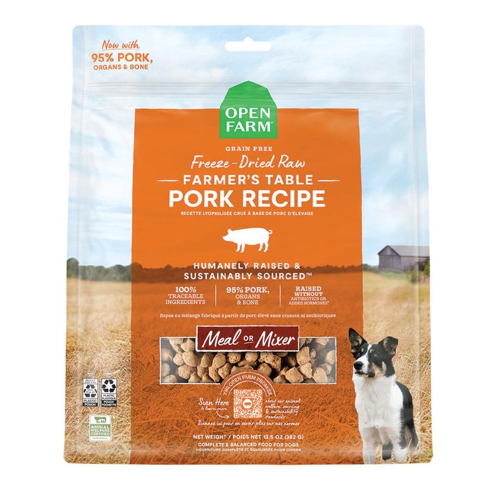 Humanely raised pork, pork heart, pork liver, ground pork bone, organic blueberries, organic carrots, organic squash, organic sunflower seeds, organic spinahc, organic kale, organic pumpkin seeds, organic cranberries, fenugreek seeds, montmorillonite clay, non-GMO coconut oil, salmon oil, chicory root, dried kelp, organic apple cider vinegar, Vitamin D3 supplement, Vitamin A supplement, riboflavin supplement, Vitamin D3 supplement, Vitamin E supplement, thiamine mononitrate, folic acid, choline, zinc amino acid chelate, copper amino acid chelate, selenium yeast, turmeric, cinnamon, mixed tocopherols, sea salt.