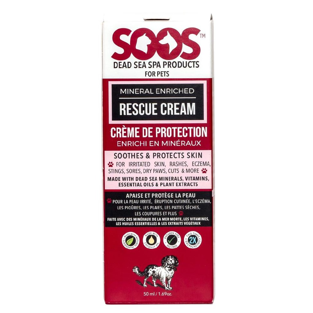 No one wants to see their pet hurting but, unfortunately, injuries happen. Be prepared when they do. Soos™ Natural Mineral Enriched Rescue Cream immediately treats dermal injuries and speeds healing because it’s a topical cream made with natural antiseptics and antibiotics. It's made with 93 different natural remedies to stop pain, create a protective barrier and prevent infection. You will be amazed at how fast the injury heals. It absorbs immediately so it's harmless when licked. It’s also safe for human use!
