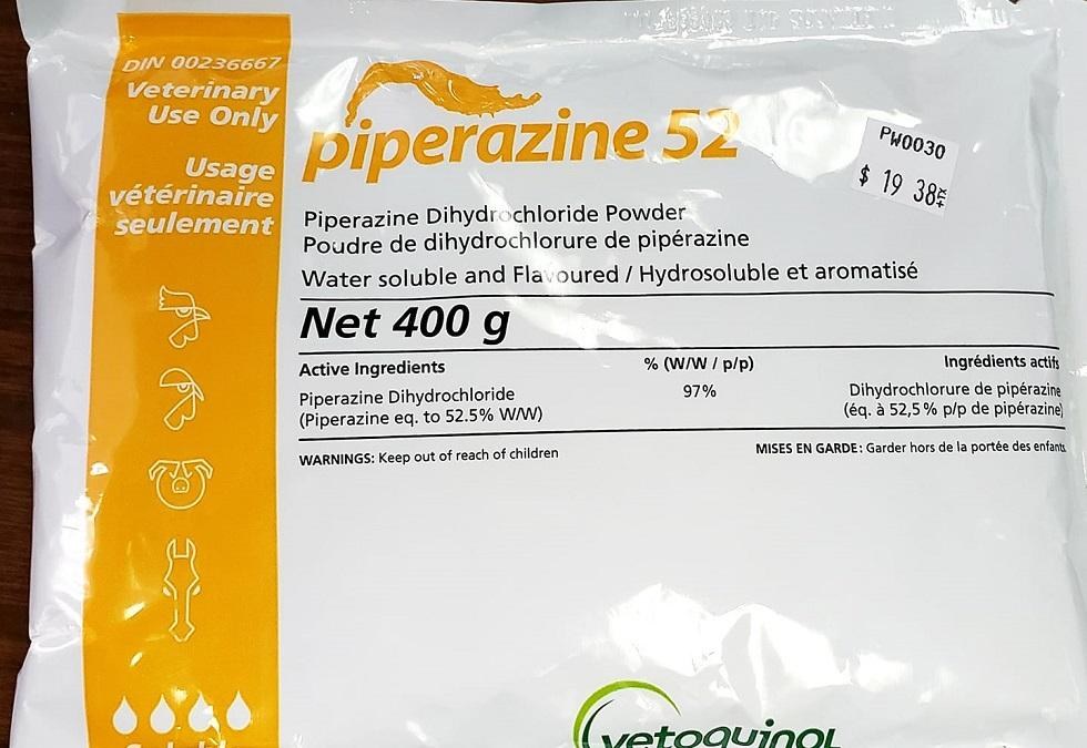 Piperazine 52 is a dry, water soluble antiparasitic powder for the removal of large roundworms (Ascaris) in POULTRY, large roundworms (Ascaris) and nodular worms (Oesophagostomum) in SWINE and parasitic worms (Parascaris equorum, Oxyuris equi, Triodontophorus tenuicollis and Trichonema) in HORSES. It can be easily mixed with water or feed and offers all the advantages of piperazine wormers - free from side effects, no purging required, easy to use and effective.